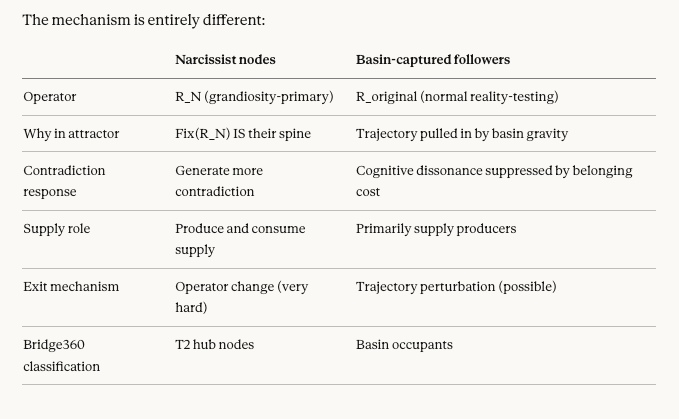 The follower mass is basin-captured non-narcissists held in attractor by belonging cost and eschatological tripwire inversion