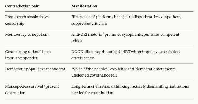 Musk is the most analytically interesting case because we can watch his breakdown happening in real time.