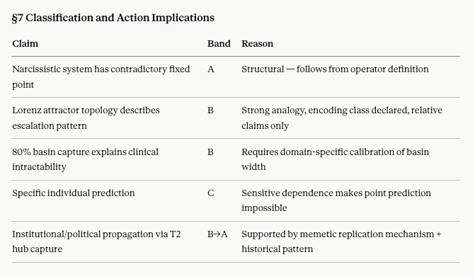 In narcissism, R is replaced by R_N: The operator that maps every input back toward confirmation of grandiosity. Fix(R_N) is not a reality-anchored self — it is a grandiosity attractor: a fixed manifold where self-image is preserved regardless of incoming signal.