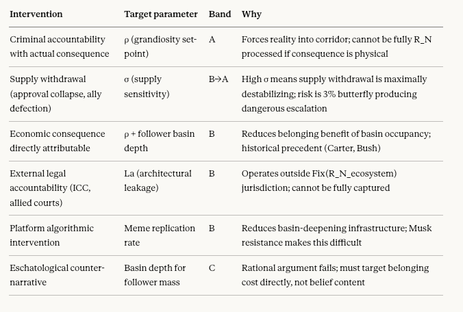 Physical, legal, financial, or political consequences so direct and unavoidable that they cannot be fully reframed. Not because they change the mind of the narcissistic core — they likely will not — but because they change the cost-benefit calculation for the basin-captured followers. When the economic pain is undeniable, when the war is genuinely unwanted, when the institutional failures are felt personally, the belonging cost of staying in the basin begins to compete with the cost of the attractor’s real-world consequences.